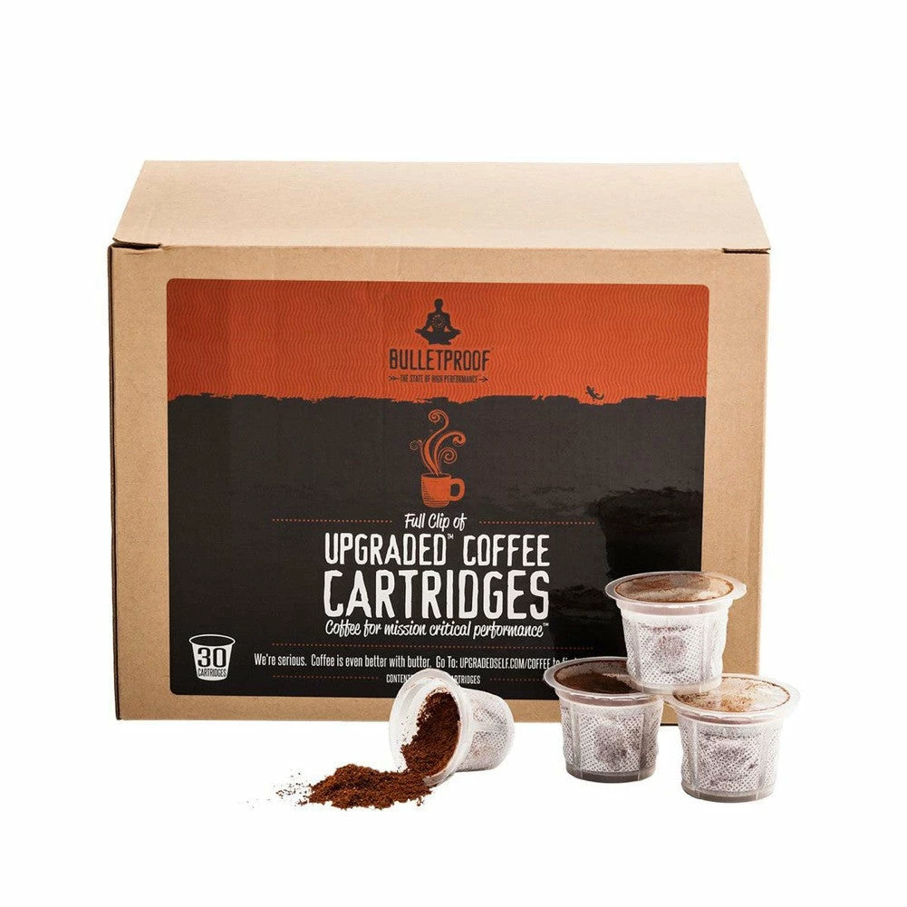 Extra Strength Bulletproof Process Coffee – Each coffee cartridge is tightly sealed with 12 grams of pre-ground Upgraded Coffee Beans. These beans were obsessively selected, tested, and exotically processed to be as free of unhealthy, performance-robbing coffee toxins as humanly possible. You’ll feel the difference in your very first cup.